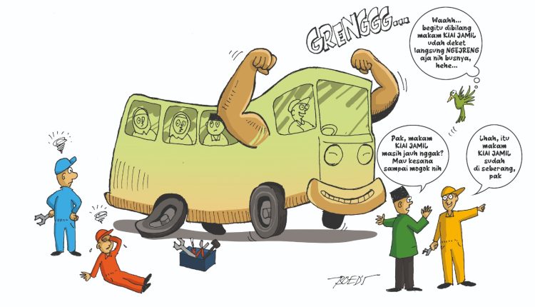Ternyata mobil itu mogok persis di depan rumah Kiai Jamil. Dan setelah tahu rumah Kiai Jamil mesin bus menyala sempurna.