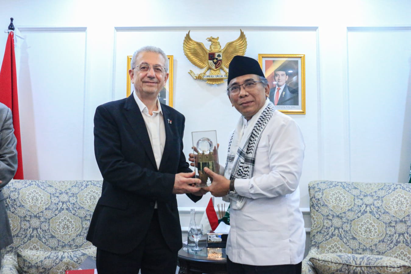 RISALAH NU-ONLINE, JAKARTA – Ketua Umum Pengurus Besar Nahdlatul Ulama (PBNU) KH Yahya Cholil Staquf menerima kunjungan delegasi tokoh-tokoh terkemuka Palestina di Kantor PBNU, Lantai 3, Jakarta Pusat, pada Selasa (2/9/2025). Pertemuan yang berlangsung selama lebih dari satu jam ini membahas situasi terkini di Palestina dan upaya mobilisasi dukungan internasional untuk menghentikan agresi Israel. Dalam pertemuan tersebut, Ketum PBNU didampingi Ketua PBNU KH Ulil Abshar Abdalla (Gus Ulil) dan Ahmad Suaedy.