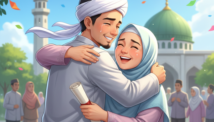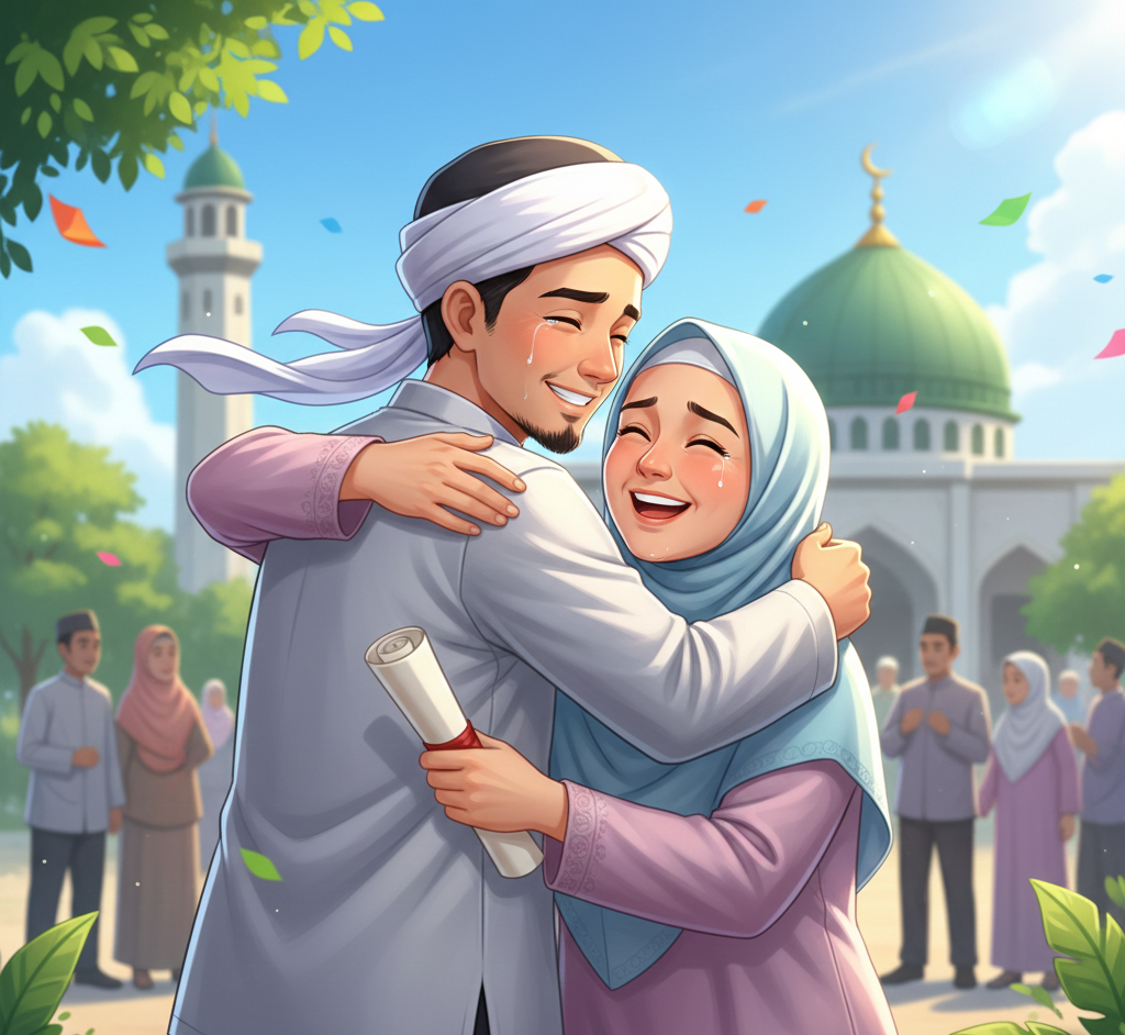 Di antara kerumunan orang tua santri, mataku menemukan ayah dan ibu, dengan pakaian yang sederhana. Wajah mereka lelah, tapi binar di mata mereka tak mampu menyembunyikan perasaan bangga yang mereka rasakan. Aku segera menghampiri, mencium tangan, memeluk mereka, lalu berbisik, “Terima kasih. Semua ini bukan karena aku sendiri, melainkan karena doa, usaha, serta ketabahan kalian dalam menghadapiku.”
