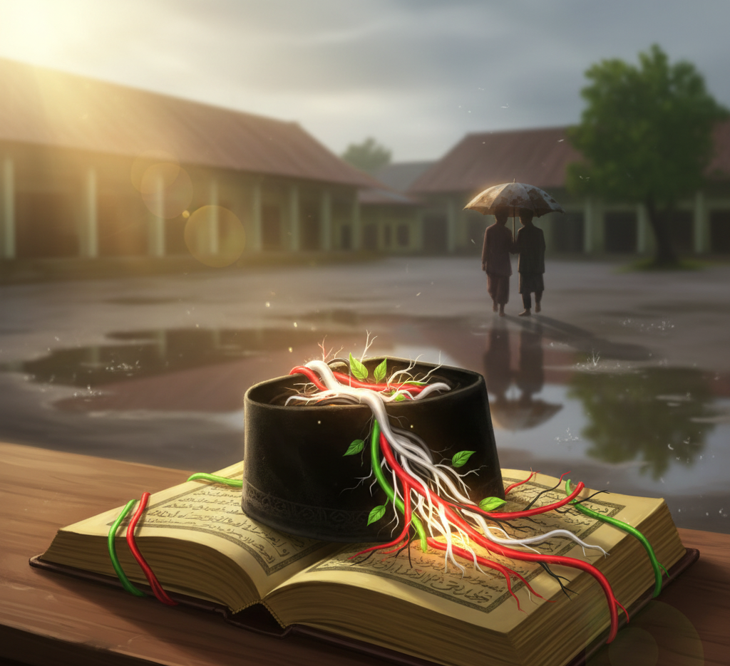 Malam mulai menggulung tirainya, diiringi semburat fajar yang berselimut mendung, gerimis berbisik lembut di setiap rintiknya, membasahi setiap sudut pesantren tua ini. Remang-remang kudengar seruan azan bersahutan dari berbagai penjuru, bersama sejuknya udara pagi. Membawa kesyahduan yang menyapu kegelisahan.
