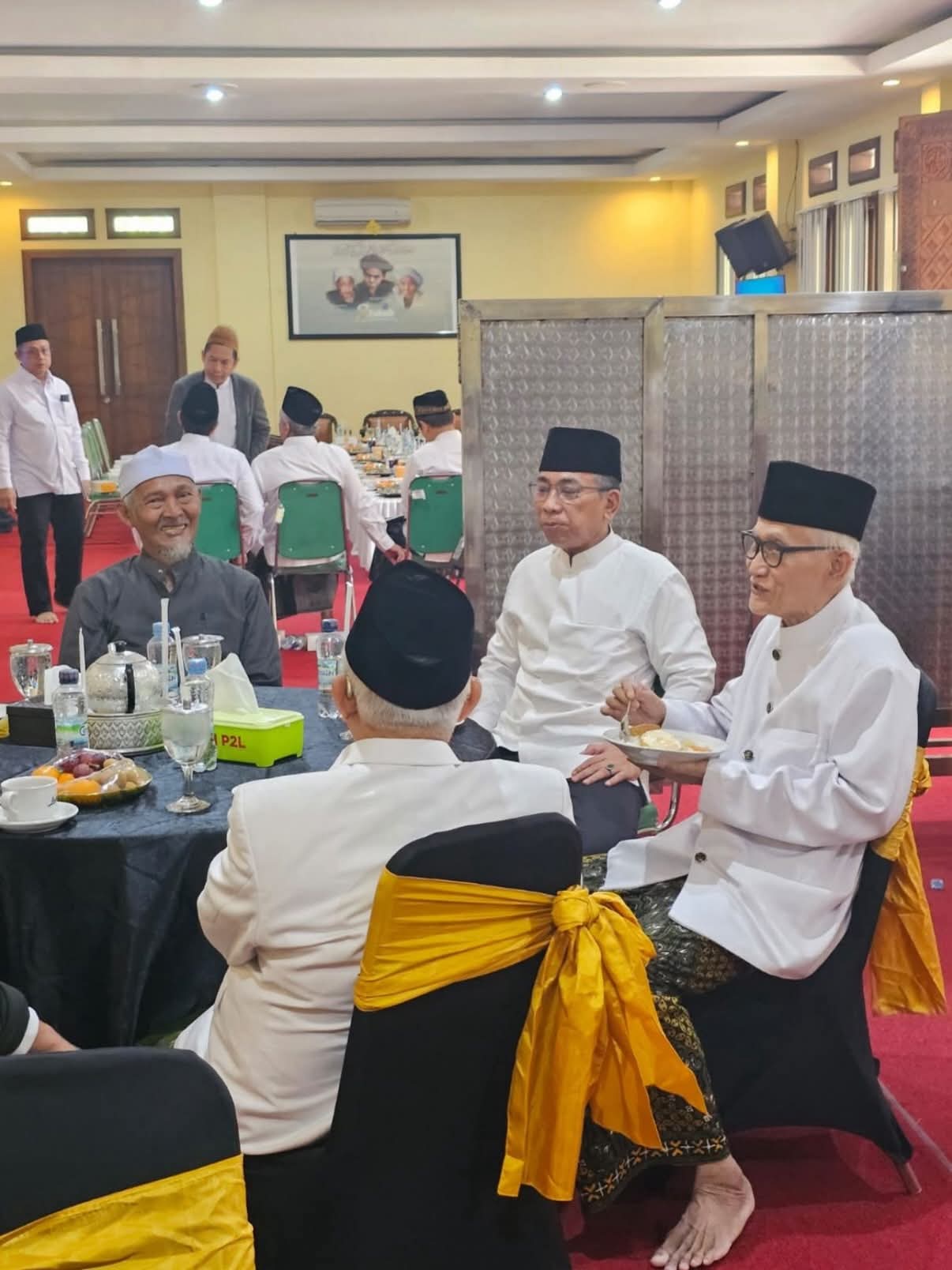 Ketum PBNU KH Yahya Cholil Staquf dan Rais Aam KH Miftachul Akhyar duduk semeja dengan salah satu Mustasyar PBNU yakni KH Ma’ruf Amin.