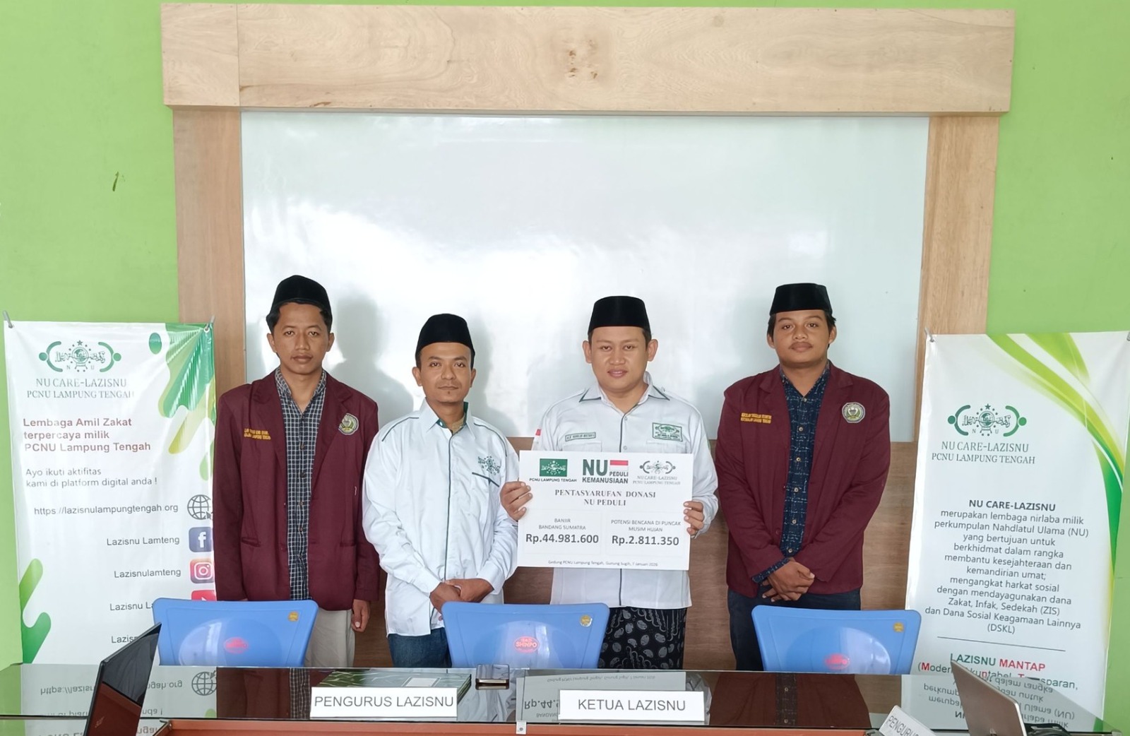RISALAH NU ONLINE, Lampung Tengah – Jajaran pengurus NU CARE Lembaga Amil Zakat, Infak, dan Shadaqah Nahdlatul Ulama (LAZISNU) PCNU Lampung Tengah, berhasil menghimpun dana kemanusiaan sebesar Rp.44.981.600,- untuk membantu korban banjir bandang di Sumatera, terutama di Provinsi Aceh, Sumatera Utara, dan Sumatera Barat, serta Rp.2.811.350,- yang dialokasikan sebagai dana darurat potensi bencana di puncak musim hujan.