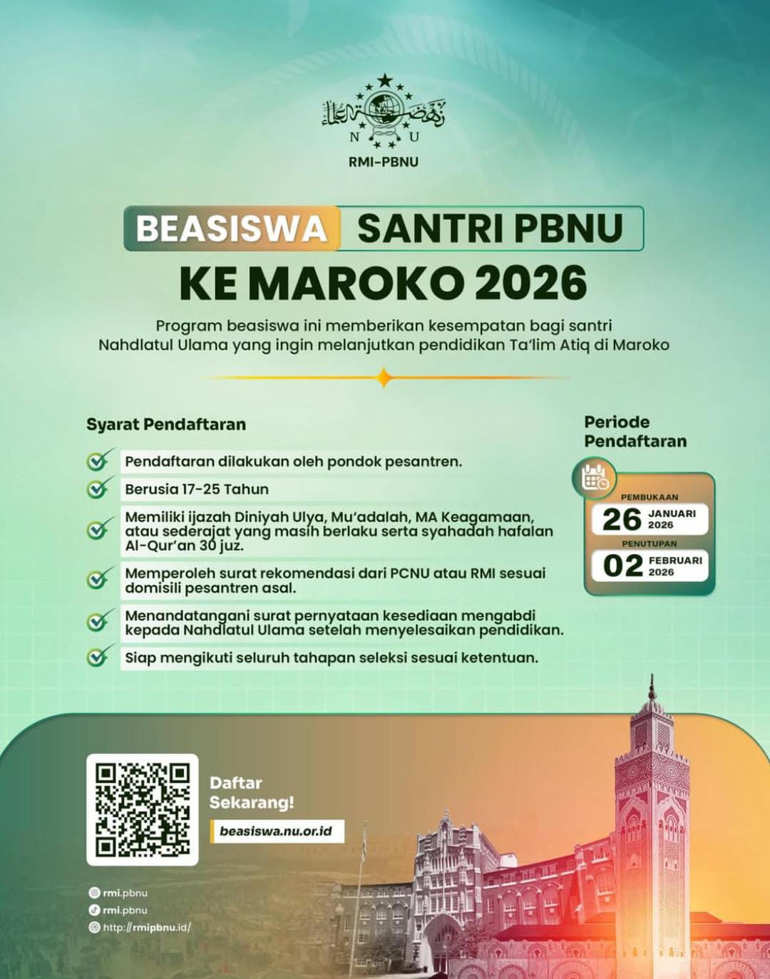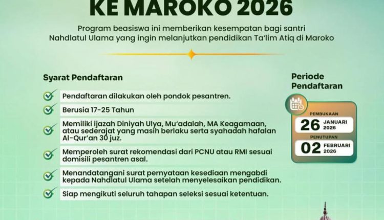 RISALAH NU-ONLINE, JAKARTA – Rabithah Ma’ahid Islamiyah (RMI) PBNU resmi membuka pendaftaran beasiswa bagi santri yang ingin melanjutkan pendidikan ta’lim ‘atiqdi Maroko. Pendaftaran ini dibuka mulai Senin (26/1/2026) hingga 2 Februari 2026.