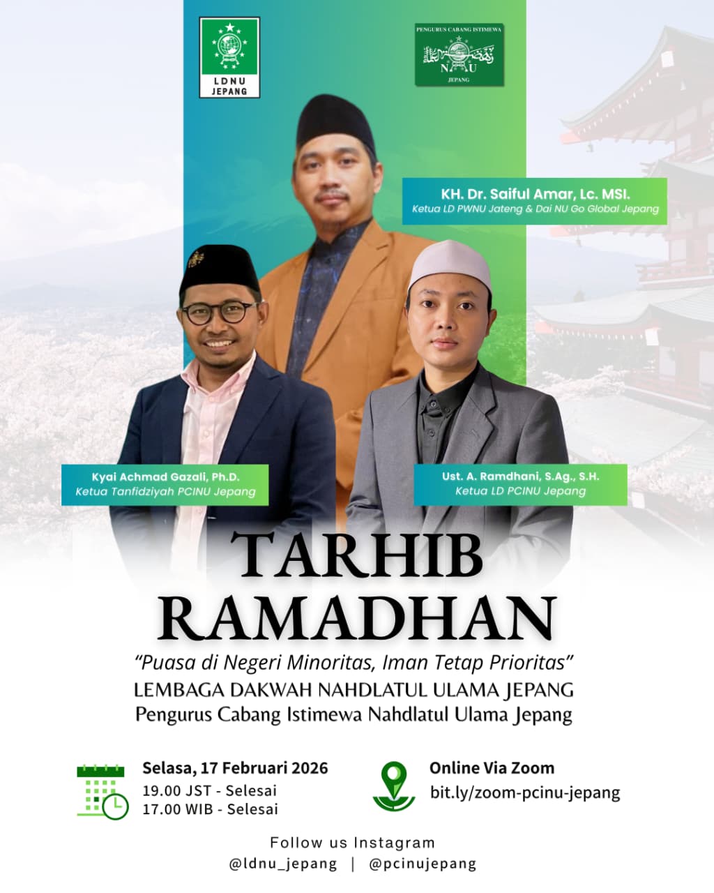 RISALAH NU Online, Jepang – Lembaga Dakwah Nahdlatul Ulama Pimpinan Cabang Istimewa Nahdlatul Ulama Jepang (LDNU PCINU Jepang) menggelar Tarhib Ramadhan 1447 Hijriah, Selasa (17/2/2026). Mengusung tema “Puasa di Negeri Minoritas, Iman Tetap Prioritas”, kegiatan ini menjadi penanda kesiapan warga Nahdliyin menyambut 1 Ramadhan di tengah kehidupan sebagai Muslim minoritas di Negeri Sakura.