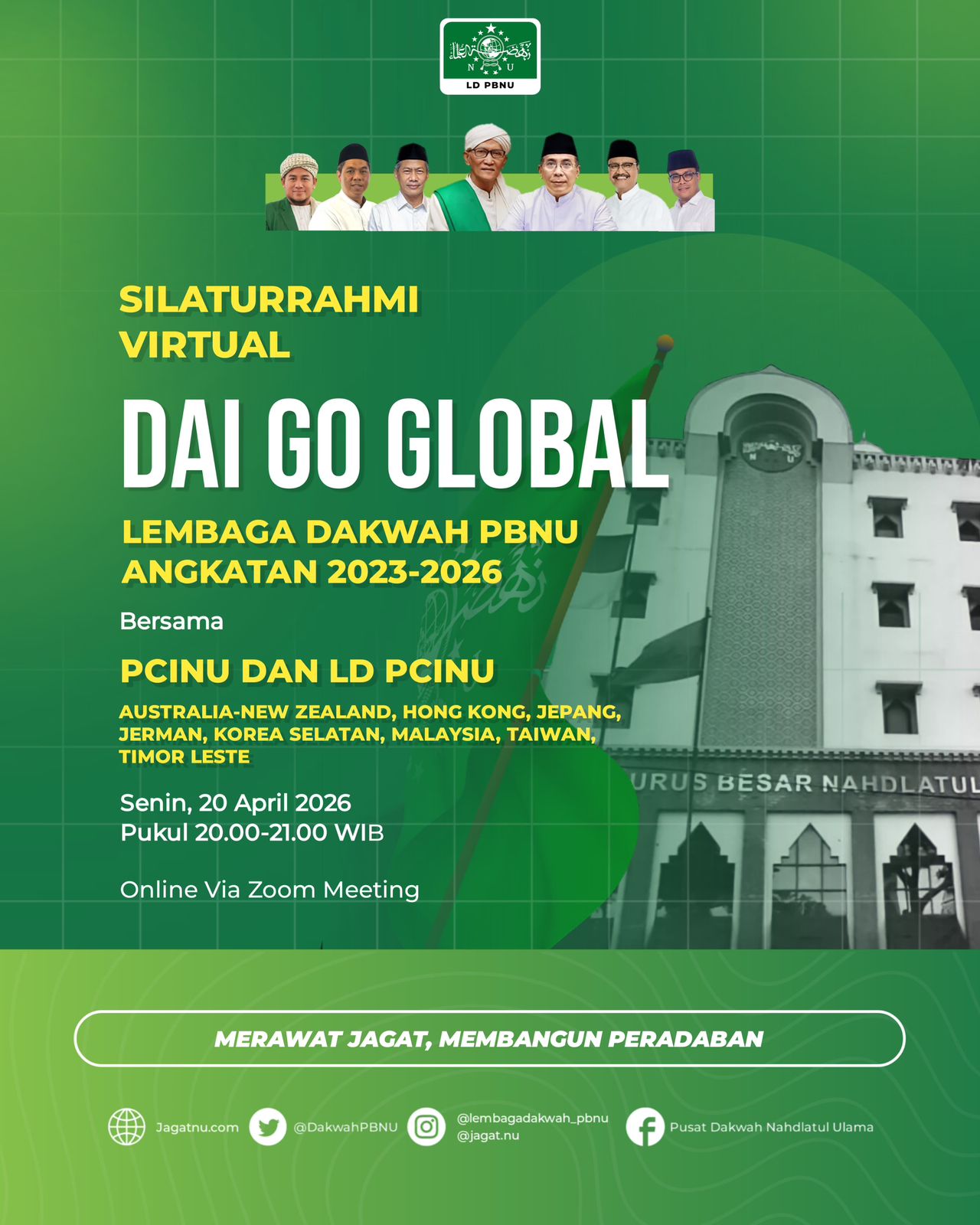 Risalah NU Online, Jakarta – Lembaga Dakwah Pengurus Besar Nahdlatul Ulama (LD PBNU) menggelar silaturahim Dai Go Global lintas angkatan 2023 hingga 2026 secara virtual pada Senin (20/4/2026). Kegiatan yang dilaksanakan melalui platform Zoom ini menjadi ruang temu strategis bagi para dai yang tersebar di berbagai negara untuk mempererat jejaring sekaligus memperkuat arah dakwah global Nahdlatul Ulama.