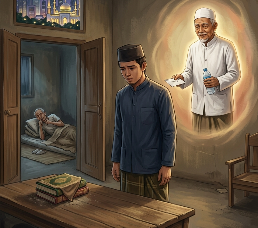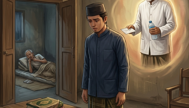 “Buat obat Ayahmu!” ujar sang kiai sambil menyelipkan amplop di saku baju Fikri. “Masya Allah … Romo. Ndak usah,” tolak Fikri halus.
