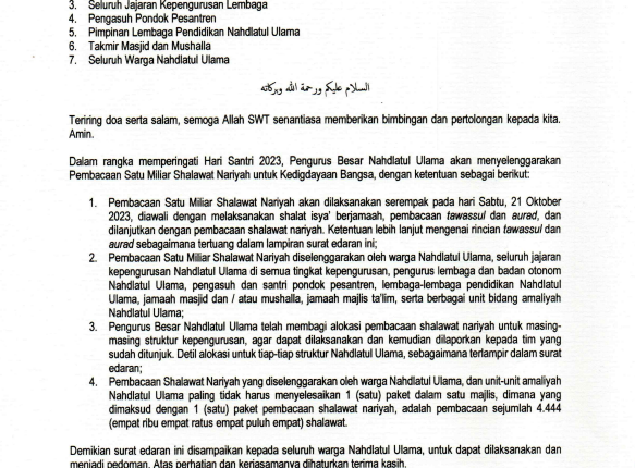Demikian surat edaran ini disampaikan kepada seluruh warga NU, untuk dapat di laksanakan dan menjadi pedoman. Atas perhatian dan kerjasamanya dihaturkan terimakasih.