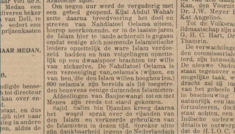 Koran Bataviaash Niewsblad dalam salah satu edisinya tahun 1932 menurunkan tulisan berjudul Nahdlatoel Oelama; Oprichtings vergadering te Batavia yang artinya rapat pendirian NU di Batavia
