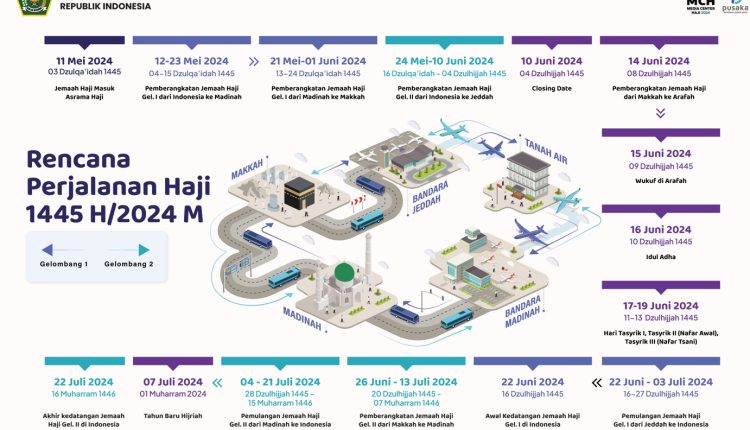 Tahun ini Indonesia rencananya akan memberangkatkan 241 ribu jemaah haji. Seperti tahun-tahun sebelumnya, calon jemaah haji akan masuk ke asrama sehari sebelum jadwal pemberangkatan dilaksanakan. Berikut rincian Rencana Perjalanan Haji 1445 H/2024 M: