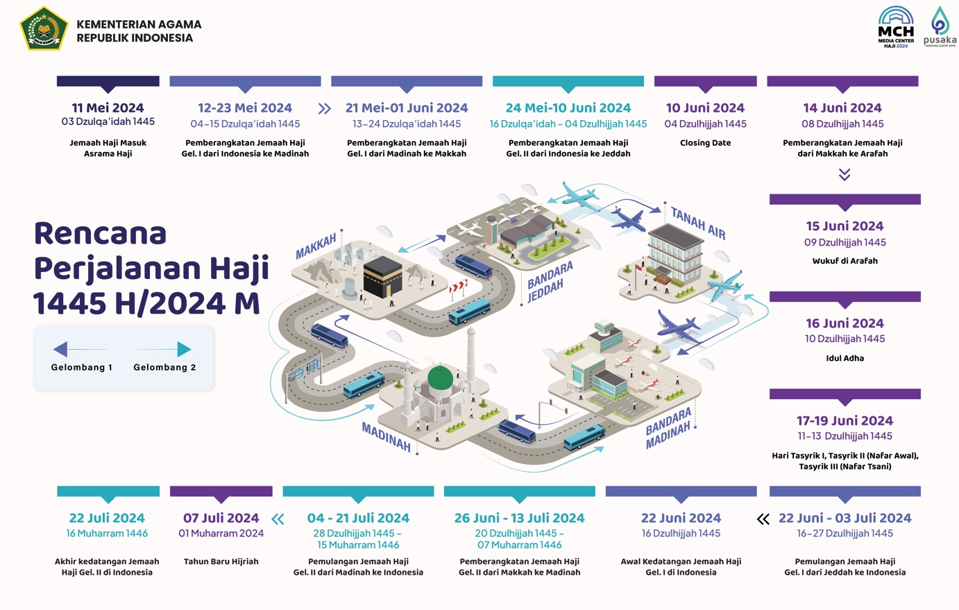 11.16 Dzulhijjah 1445 / 22 Juni 2024, Awal Kedatangan Jemaah Haji Gelombang I di Indonesia