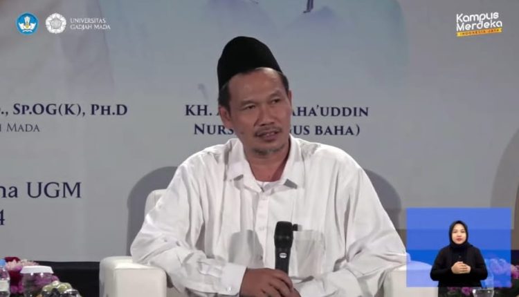 Gus Baha menyampaikan guyonannya dalam Dialog Kebangsaan Menyongsong Ramadhan dengan Tema “Merawat Ukhuwah Kebangsaan Menjaga Persatuan Indonesia” yang digelar Universitas Gajah Mada pada Senin, 4 Maret 2024.