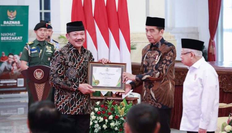 Penghargaan Lifetime Achievement diserahkan langsung oleh Ketua BAZNAS RI, Prof. Dr. KH. Noor Achmad kepada Presiden Jokowi dan Wakil Presiden Ma’ruf Amin dalam acara Zakat Istana di Istana Presiden, Rabu (13/3/2024).