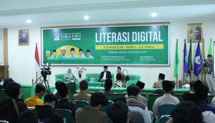 RISALAH NU ONLINE, Banyumas – Lembaga Dakwah PBNU (LD PBNU) bersama Pengurus Besar Nahdlatul Ulama (PBNU) dan Kementerian Komunikasi dan Informatika Republik Indonesia dan Lembaga Dakwah PBNU mengadakan acara Literasi Digital Edisi ke-2 yang bertajuk “Dakwah Ramah di Era Post Truth” di Gedung PCNU Kabupaten Banyumas pada hari Sabtu (16/3/2024).
