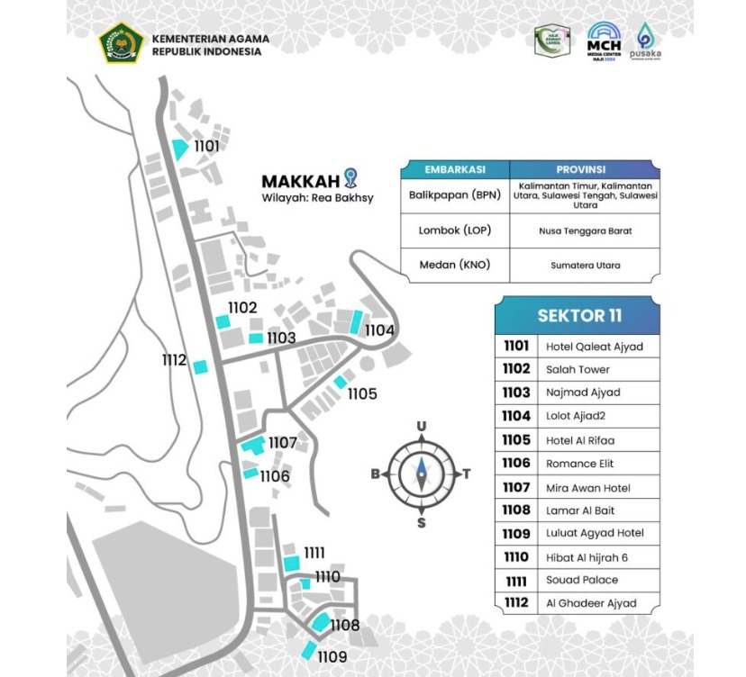 Di Makkah, lanjut Subhan, penempatan jemaah haji Indonesia terbagi pada lima wilayah, yaitu: Syisyah, Raudhah, Jarwal, Misfalah, dan Rey Bakhsy. Jemaah asal Embarkasi Makassar akan menempati wilayah Syisyah dan Raudhah. Demikian juga jemaah yang berangkat dari Embarkasi Jakarta – Pondok Gede (JKG).