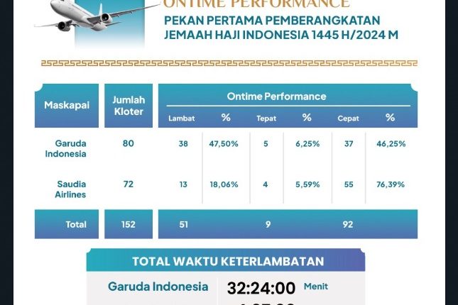 “Untuk Saudia Airlines, dalam sepekan ini mengalami keterlambatan pemberangkatan hingga 18,06% dari total 72 penerbangan. Total keterlambatan mencapai empat jam tujuh menit. Saya harap peristiwa keterlambatan bisa terus ditekan,” sebut Anna.