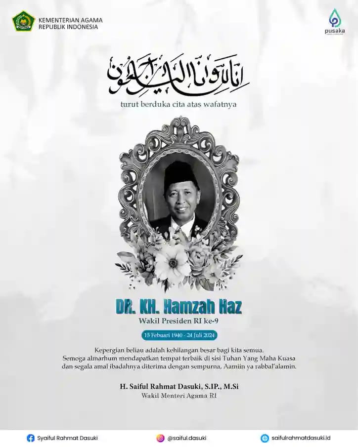 Pesan turut berduka cita atas wafatnya Dr. KH. Hamzah Haz Wakil Presiden Republik Indonesia ke-9 juga disampaikan Ketua DPW PPP DKI Jakarta yang juga Wakil Menteri Agama RI, H Saiful Rahmat Dasuki. “Kepergian beliau adalah kehilangan besar bagi kita semua,” kata H Saiful Rahmat Dasuki.