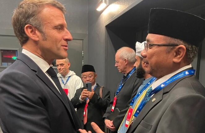 “Presiden Macron menyambut salam dari Presiden Jokowi dengan gembira. Dia mengatakan bahwa dirinya dengan Presiden Jokowi bersahabat baik. Presiden Macron juga menyampaikan optimismenya bahwa Indonesia dan Prancis bisa saling menggali persamaan untuk berkontribusi pada perdamaian dunia,” sambung Menag.