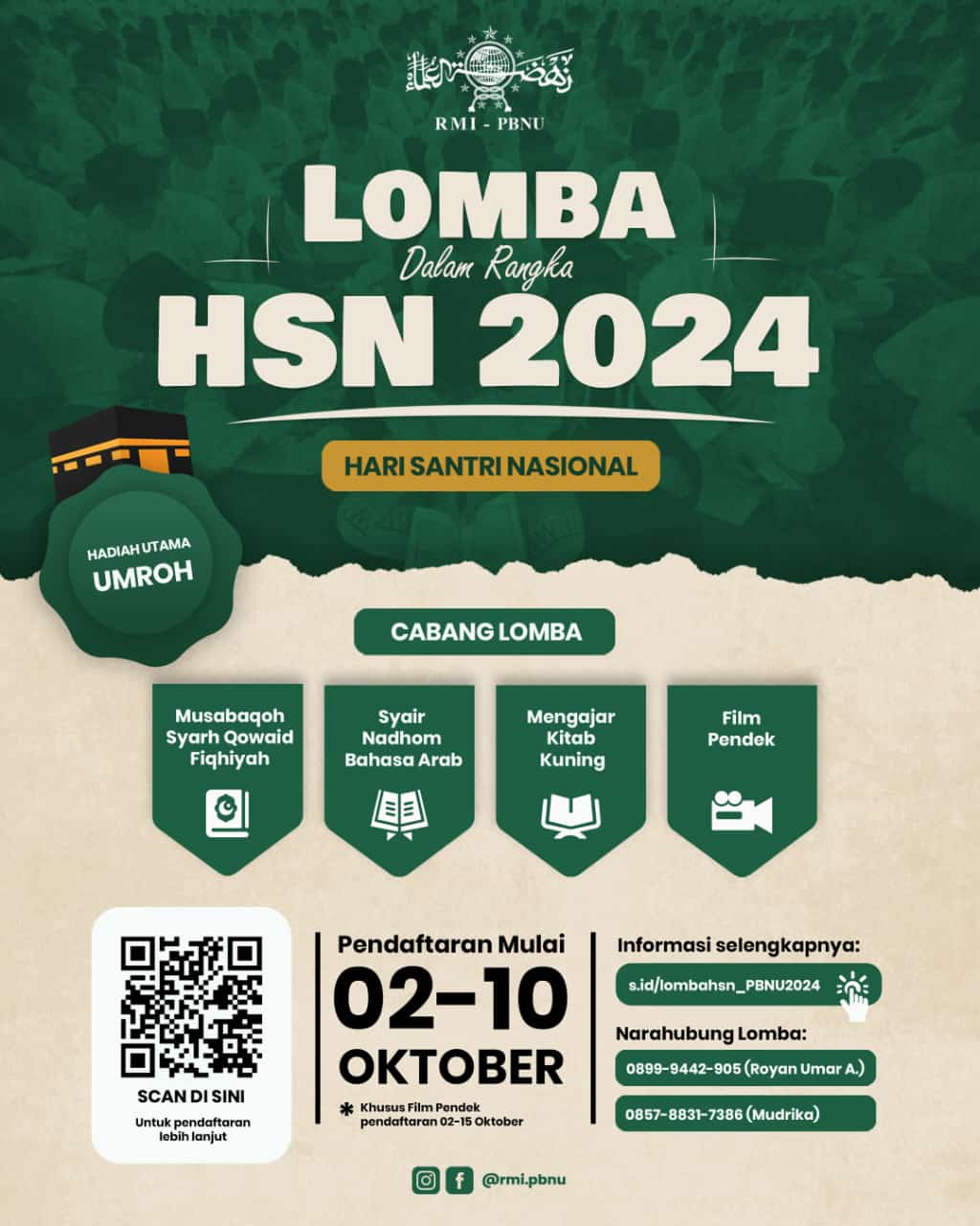 RISALAH NU ONLINE, JAKARTA – Rabithah Ma’ahid Islamiyah (RMI) PBNU menyelenggarakan empat perlombaan dalam rangka peringatan Hari Santri Nasional (HSN) 2024.