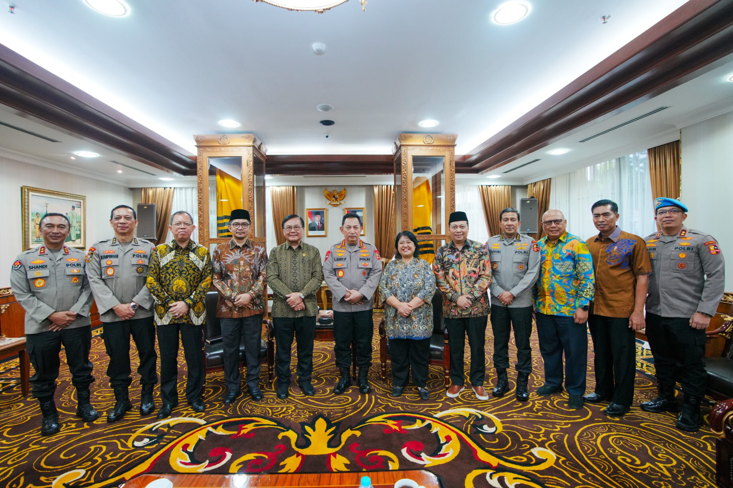 Anggota Harian Kompolnas hadir lengkap berseragam batik coklat lengan panjang mulai dari Irjen Pol. (Purn) Dr. Benny J. Mamoto, S.H., M.Si, Irjen Pol. (Purn) Drs. Pudji Hartanto Iskandar, M.M., Prof. Dr. Albertus Wahyurudhanto, M.Si, Dr.Yusuf Warsyim, S.Ag., M.H., dan H. Mohammad Dawam, SHI., M.H., dengan didampingi Kepala Sekretariat Kompolnas, Irjen Pol. Musa Ikipson Tampubolon, S.H., S.I.K, M.Si yang mengenakan seragam lengkap Polri.