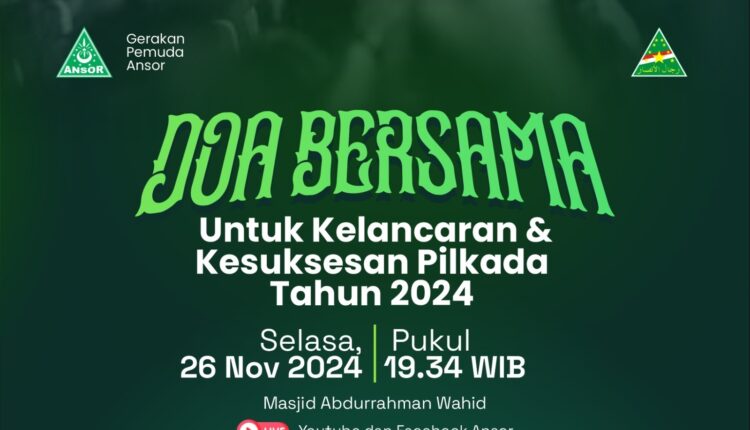 RISALAH NU ONLINE, JAKARTA – Pimpinan Pusat Gerakan Pemuda Ansor akan menggelar Doa Bersama untuk Kelancaran dan Kesuksesan Pilkada 2024. Kegiatan ini akan dilaksanakan di Masjid Abdurrahman Wahid Gedung GP Ansor Jakarta, Selasa, 26 November 2024.
